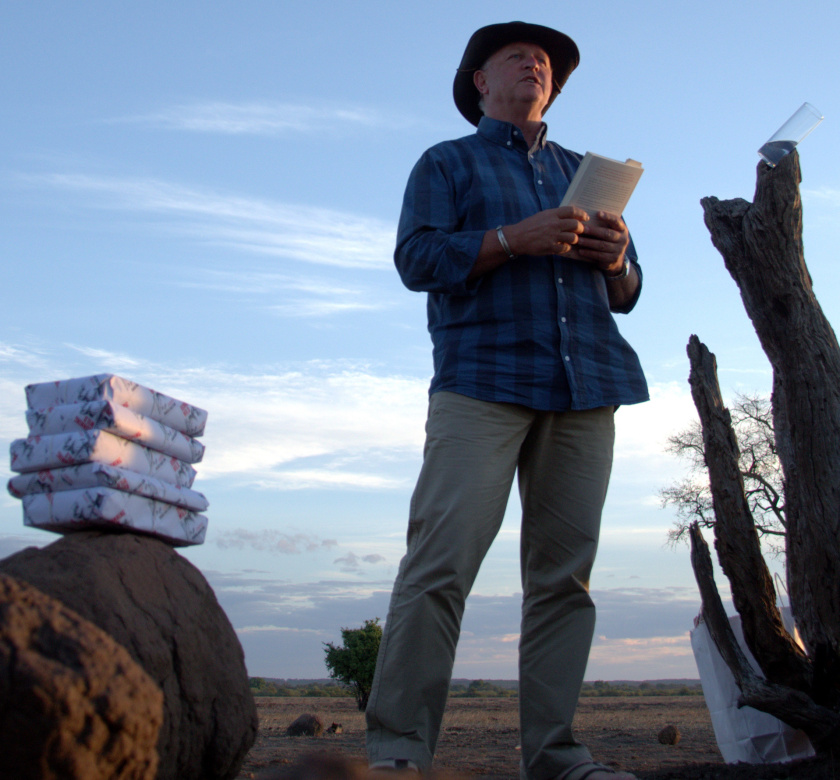 The Storyteller entertaining the crowd at Mashatu Game Reserve – where most of the story takes place: the launch of his book Running Wild: The Story of Zulu, an African Stallion.